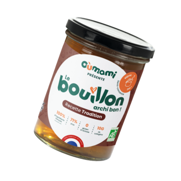Un concentré de saveurs et de savoir-faire artisanal, notre bouillon Tradition est unique sur le marché ! Confectionné avec 100 % d’ingrédients français (hors épices rares), ce bouillon d’os (bone broth) est élaboré à partir de 71 % d’os de poulet et de porc, et mijoté lentement pendant 24 heures pour en extraire toute la richesse gustative et nutritionnelle. Retour en enfance assuré !
